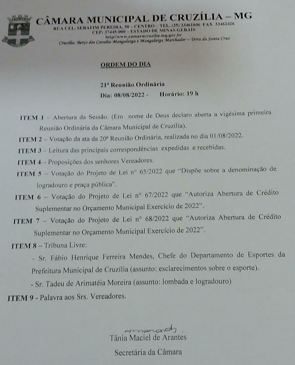 Pauta da 21ª Reunião Ordinária. Dia: 08/08/2022